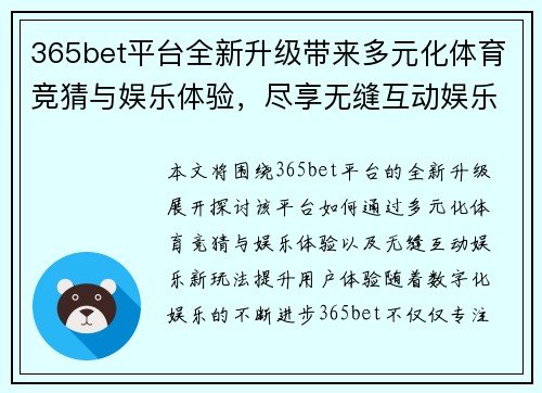 本文将围绕365bet平台的全新升级展开,探讨该平台如何通过多元化体育竞猜与娱乐体验以及无缝互动娱乐新玩法,提升用户体验。随着数字化娱乐的不断进步,365bet不仅仅专注于提供传统的体育竞猜服务,还通过创新设计与技术升级,为用户带来更具互动性和多样化的娱乐内容。从全新的界面设计到丰富的娱乐功能,再到全平台跨设备互动体验,365bet通过不断优化用户体验,已成为体育竞猜与娱乐产业中的重要一员。本文将从以下几个方面详细介绍365bet的全新升级:平台的多元化体育竞猜功能、娱乐体验的创新方式、无缝互动的娱乐新玩法、以及全平台跨设备的互动升级。通过这些方面的详细阐述,您将了解365bet如何借助创新的科技提升玩家的娱乐感受,并为未来的数字娱乐模式提供有力参考。
