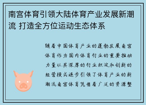 随着中国体育产业的蓬勃发展,南宫体育作为国内体育行业的重要推动力量,以其深厚的行业积淀和创新的经营模式,逐步引领了体育产业的新潮流。南宫体育凭借着广泛的资源整合能力,创新的商业模式以及对体育产业深刻的理解,力图打造一个全方位、立体化的运动生态体系。本文将从四个方面详细探讨南宫体育如何引领大陆体育产业的发展潮流,涵盖从产业资源整合到跨界合作的各个维度,全面分析其在推动行业创新和发展的重要作用。
